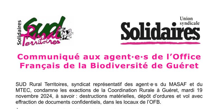 SUD Rural Territoires, syndicat représentatif des agent·e·s du MASAF et du MTE, condamne les exactions de la Coordination Rurale à Guéret, mardi 19 novembre 2024, à savoir : destructions matérielles, dépôt d’ordures et vol avec effraction de documents confidentiels, dans les locaux de l’OFB.