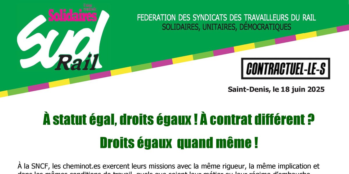 C’est pour cela que la commission contractuel.les de SUD-Rail agit au quotidien : défendre une logique d’équité et de justice sociale entre tous les cheminot.es, sans opposer les statuts ni entretenir de divisions. Le cœur de notre démarche est clair : à travail de même valeur, droits de même niveau.