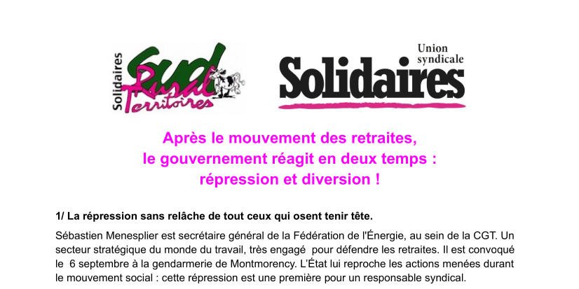 Malgré une lutte courageuse, la réforme des retraites est finalement appliquée depuis le 1er septembre. Cinq jours après seulement, Sébastien Menesplier est convoqué. Les autorités lui reprochent des actions menées à Annonay, la ville du ministre du Travail Olivier Dussopt, le 8 mars, date à laquelle il n’était pourtant pas présent dans cette ville. C’est clairement un coup de pression, une vengeance d’État.