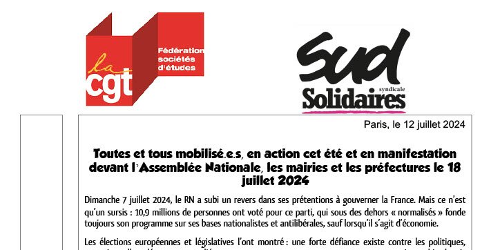 À l’heure où les basses œuvres politiciennes tentent de nous voler le verdict des urnes, il est de notre responsabilité de rester mobilisés cet été. C’est aujourd’hui dans les entreprises et dans la rue que nous pourrons influer, pour porter nos revendications et faire en sorte qu’elles soient satisfaites :