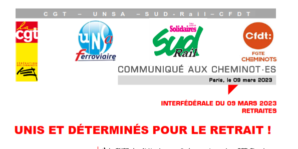 Les fédérations syndicales représentatives CGT Cheminots, UNSAFerroviaire, SUD-Rail, CFDT Cheminots appellent à participer massivement aux AG et proposent unitairement :