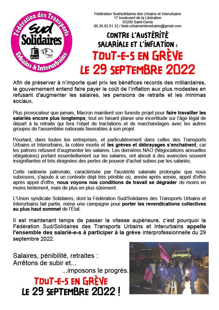 Il est maintenant temps de passer la vitesse supérieure, c’est pourquoi la Fédération Sud/Solidaires des Transports Urbains et Interurbains appelle l'ensemble des salarié-e-s à participer à la grève interprofessionnelle du 29 septembre 2022.