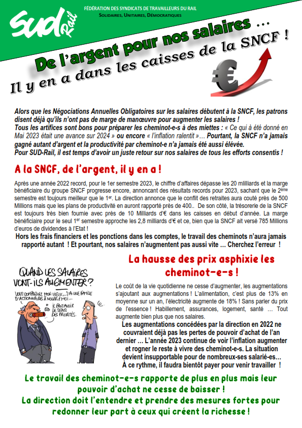 Tous les artifices sont bons pour préparer les cheminot-e-s à des miettes : « Ce qui à été donné en Mai 2023 était une avance sur 2024 » ou encore « l’inflation ralentit »… Pourtant, la SNCF n’a jamais gagné autant d’argent et la productivité par cheminot-e n’a jamais été aussi élevée. Pour SUD-Rail, il est temps d’avoir un juste retour sur nos salaires de tous les efforts consentis !