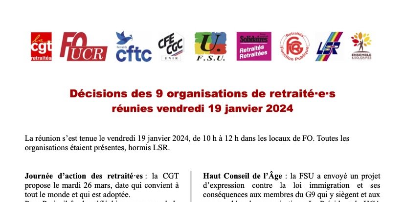 Voici le relevé des décisions prises par les 9 organisations de retraité·es et, en fichier complémentaire ci-contre, le compte-rendu complet et interne de cette réunion.