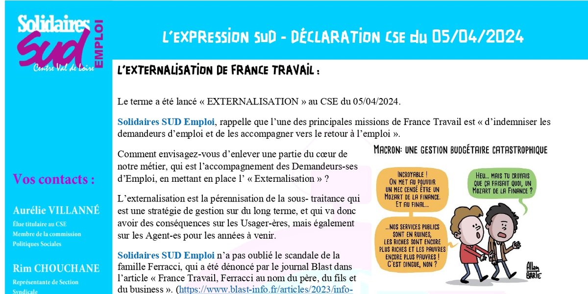 Déclaration CSE du 05/04/2024 : externalisation de France Travail