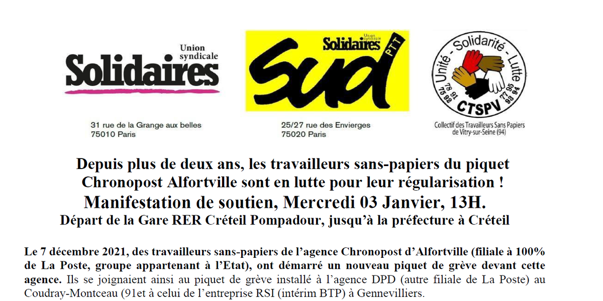 Depuis plus de deux ans, les travailleurs sans-papiers du piquet Chronopost Alfortville sont en lutte pour leur régularisation ! Manifestation de soutien, Mercredi 03 Janvier, 13H