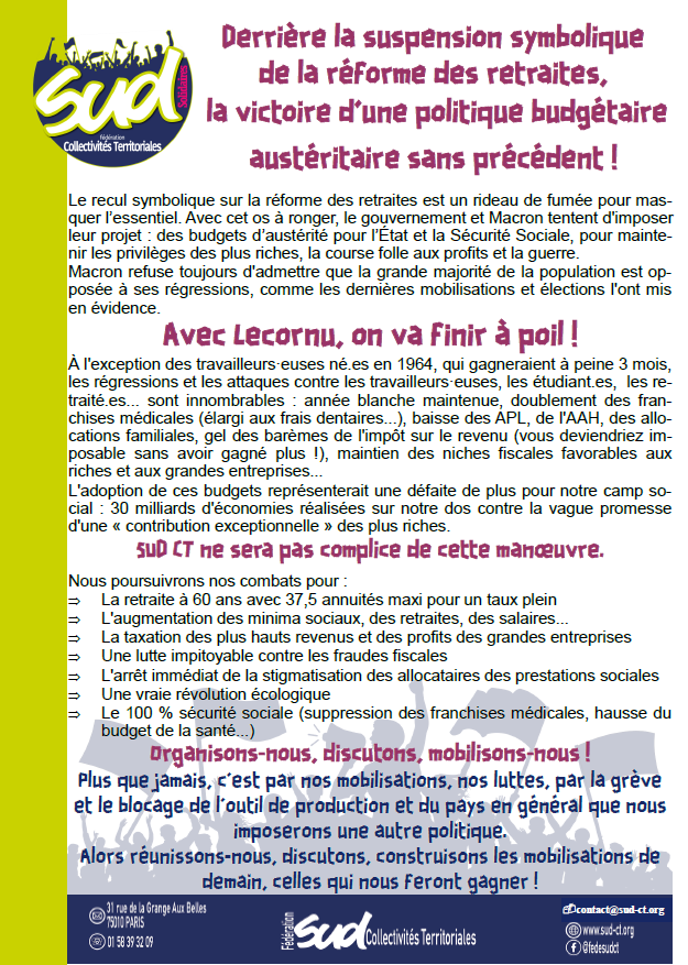 Le recul symbolique sur la réforme des retraites est un rideau de fumée pour masquer l’essentiel. Avec cet os à ronger, le gouvernement et Macron tentent d'imposer leur projet : des budgets d’austérité pour l’État et la Sécurité Sociale, pour maintenir les privilèges des plus riches, la course folle aux profits et la guerre. Macron refuse toujours d'admettre que la grande majorité de la population est op-posée à ses régressions, comme les dernières mobilisations et élections l'ont mis en évidence.
