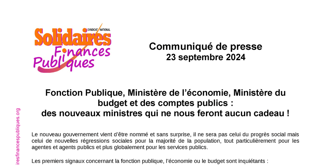 Face à ce nouveau gouvernement, Solidaires Finances Publiques entend porter d’autres choix en matière de politiques publiques et appelle les personnels à participer massivement à la grève interprofessionnelle du 1er octobre prochain pour faire entendre nos revendications !