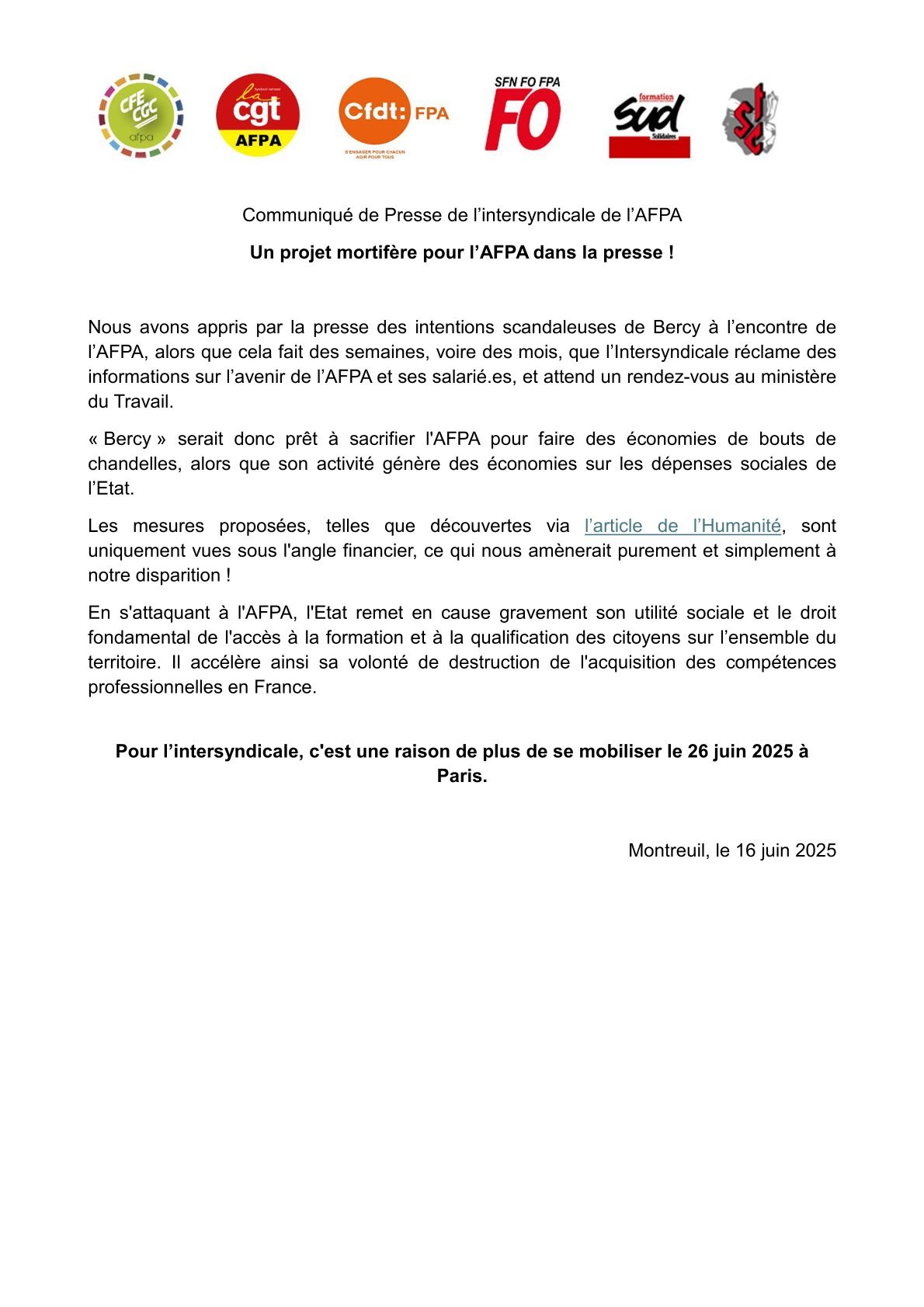 Communiqué de presse Intersyndicale AFPA - article HUMA - 16 juin 2025 (pdf)