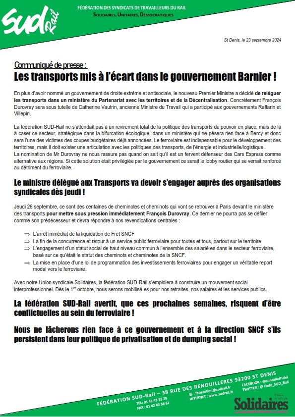 La fédération SUD-Rail ne s’attendait pas à un revirement total de la politique des transports du pouvoir en place, mais de là à caser ce secteur, stratégique dans la bifurcation écologique, dans un ministère qui ne pèsera rien face à Bercy et donc sera l’une des victimes des coupes budgétaires déjà annoncées. Le ferroviaire est indispensable pour le développement des territoires, mais il doit exister une articulation avec les politiques des transports, de l’énergie et industrielle/logistique.