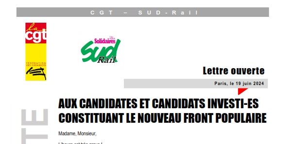 Les fédérations syndicales CGT et SUD-Rail interpellent solennellement les candidates et candidats constituant le Nouveau Front Populaire à travers cette lettre ouverte afin que, dans le respect de la diversité et du rôle des uns et des autres, vous preniez l’engagement, dans la campagne et à l’issue, de porter un retour à une entreprise publique unique et intégrée notamment en mettant en avant les 5 points suivant :