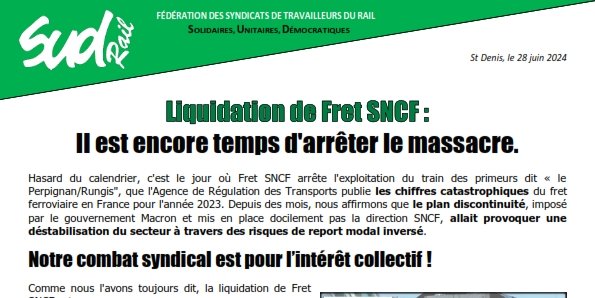 Hasard du calendrier, c'est le jour où Fret SNCF arrête l'exploitation du train des primeurs dit « le Perpignan/Rungis", que l'Agence de Régulation des Transports publie les chiffres catastrophiques du fret ferroviaire en France pour l'année 2023. Depuis des mois, nous affirmons que le plan discontinuité, imposé par le gouvernement Macron et mis en place docilement pas la direction SNCF, allait provoquer une déstabilisation du secteur à travers des risques de report modal inversé.