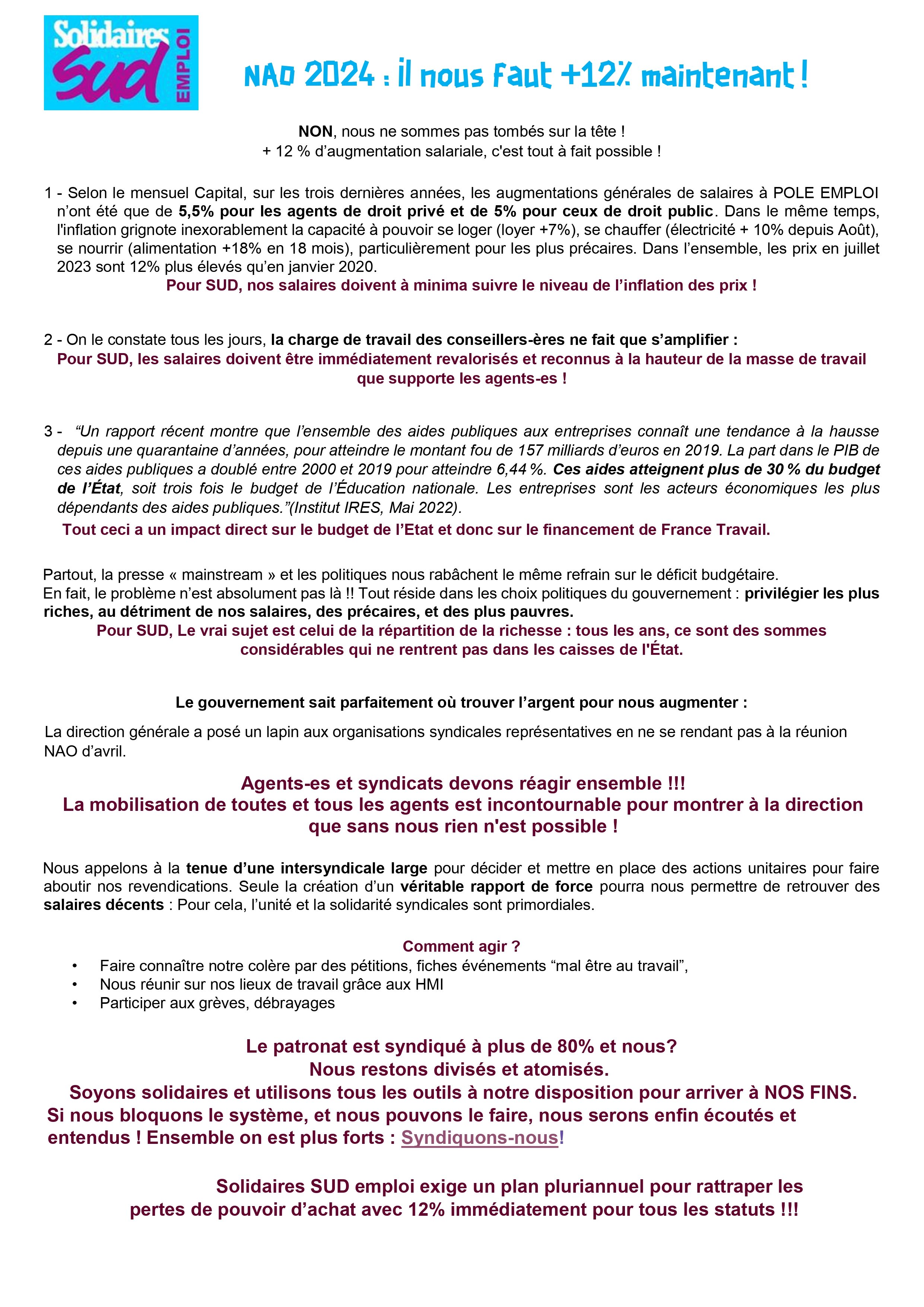 2 - On le constate tous les jours, la charge de travail des conseillers-ères ne fait que s’amplifier : Pour SUD, les salaires doivent être immédiatement revalorisés et reconnus à la hauteur de la masse de travail que supporte les agents-es !