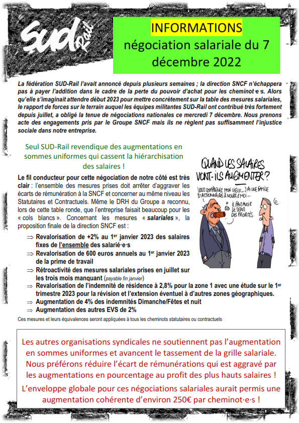 La fédération SUD-Rail l’avait annoncé depuis plusieurs semaines ; la direction SNCF n’échappera pas à payer l’addition dans le cadre de la perte du pouvoir d’achat pour les cheminot·e·s. Alors qu’elle s’imaginait attendre début 2023 pour mettre concrètement sur la table des mesures salariales, le rapport de forces sur le terrain auquel les équipes militantes SUD-Rail ont contribué très fortement depuis juillet, a obligé la tenue de négociations nationales ce mercredi 7 décembre. Nous prenons acte des engagements pris par le Groupe SNCF mais ils ne règlent pas suffisamment l’injustice sociale dans notre entreprise.
