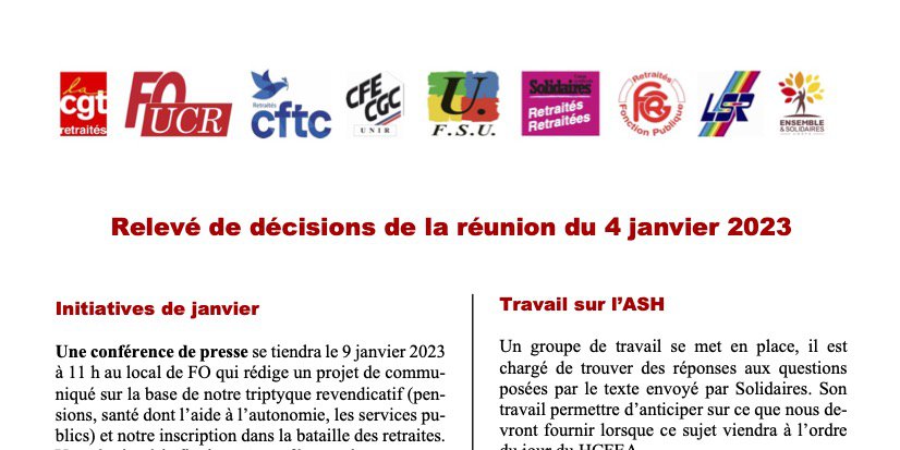 En complément du communiqué de presse ci-dessous, figurent dans les fichiers à télécharger le relevé de décisions de la réunion du 4 janvier des 9 organisations des retraité·e·s et le compte-rendu complet de cette réunion, interne à l'Unirs.