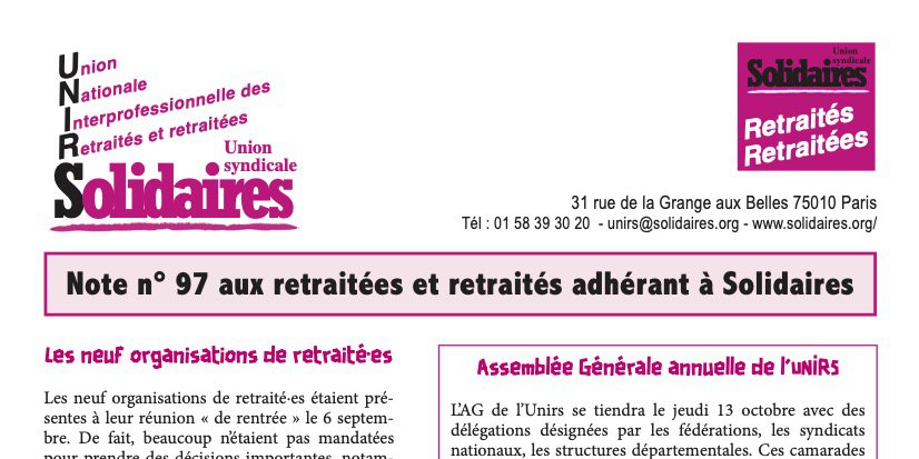 - Assemblée Générale annuelle de l’UNIRS le 13 octobre