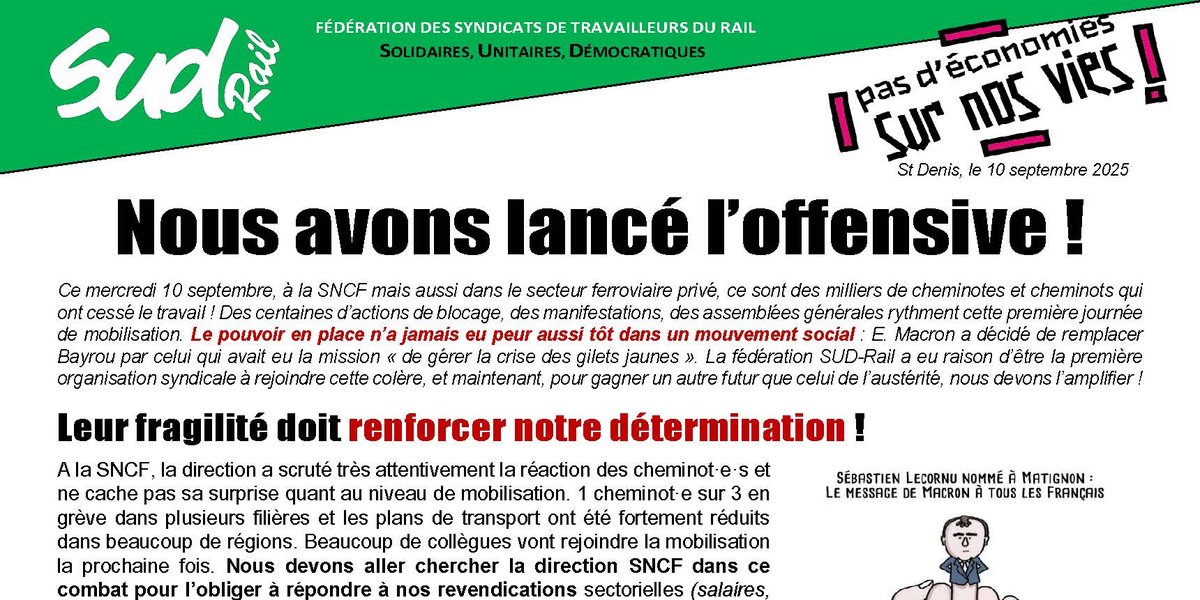 Ce mercredi 10 septembre, à la SNCF mais aussi dans le secteur ferroviaire privé, ce sont des milliers de cheminotes et cheminots qui ont cessé le travail ! Des centaines d’actions de blocage, des manifestations, des assemblées générales rythment cette première journée de mobilisation. Le pouvoir en place n’a jamais eu peur aussi tôt dans un mouvement social : E. Macron a décidé de remplacer Bayrou par celui qui avait eu la mission « de gérer la crise des gilets jaunes ». La fédération SUD-Rail a eu raison d’être la première organisation syndicale à rejoindre cette colère, et maintenant, pour gagner un autre futur que celui de l’austérité, nous devons l’amplifier !