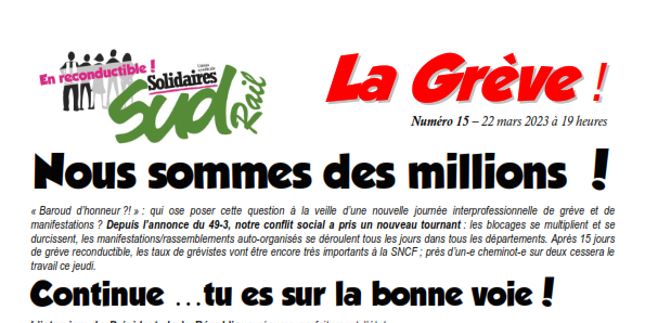 « Baroud d’honneur ?! » : qui ose poser cette question à la veille d’une nouvelle journée interprofessionnelle de grève et de manifestations ? Depuis l’annonce du 49-3, notre conflit social a pris un nouveau tournant : les blocages se multiplient et se durcissent, les manifestations/rassemblements auto-organisés se déroulent tous les jours dans tous les départements. Après 15 jours de grève reconductible, les taux de grévistes vont être encore très importants à la SNCF ; près d’un-e cheminot-e sur deux cessera le travail ce jeudi.