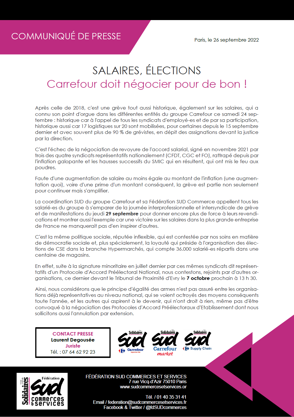 La coordination SUD du groupe Carrefour et sa Fédération SUD Commerce appellent tous les salarié-es du groupe à s'emparer de la journée interprofessionnelle et intersyndicale de grève et de manifestations du jeudi 29 septembre pour donner encore plus de force à leurs revendications et montrer aussi l'exemple car une victoire sur les salaires dans la plus grande entreprise de France ne manquerait pas d'en inspirer d'autres.