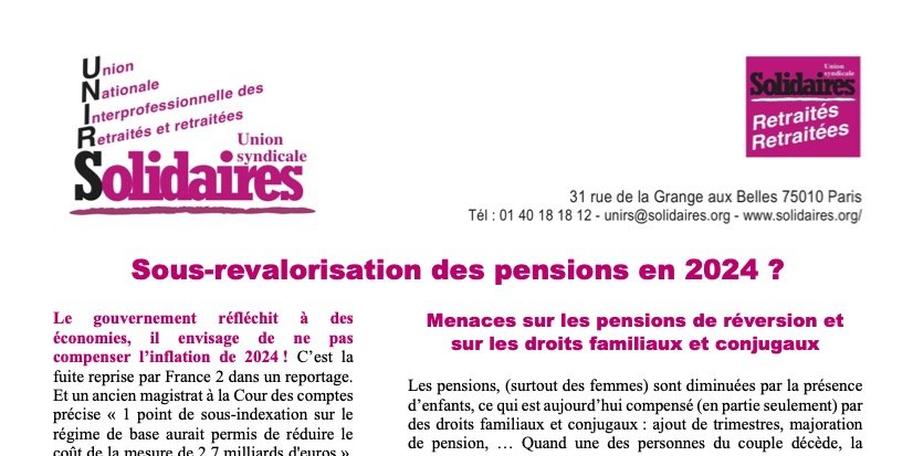 Le gouvernement réfléchit à des économies, il envisage de ne pas compenser l’inflation de 2024 ! C’est la fuite reprise par France 2 dans un reportage. Et un ancien magistrat à la Cour des comptes précise « 1 point de sous-indexation sur le régime de base aurait permis de réduire le coût de la mesure de 2,7 milliards d'euros ». Pourtant 83 % de la population s’y oppose !