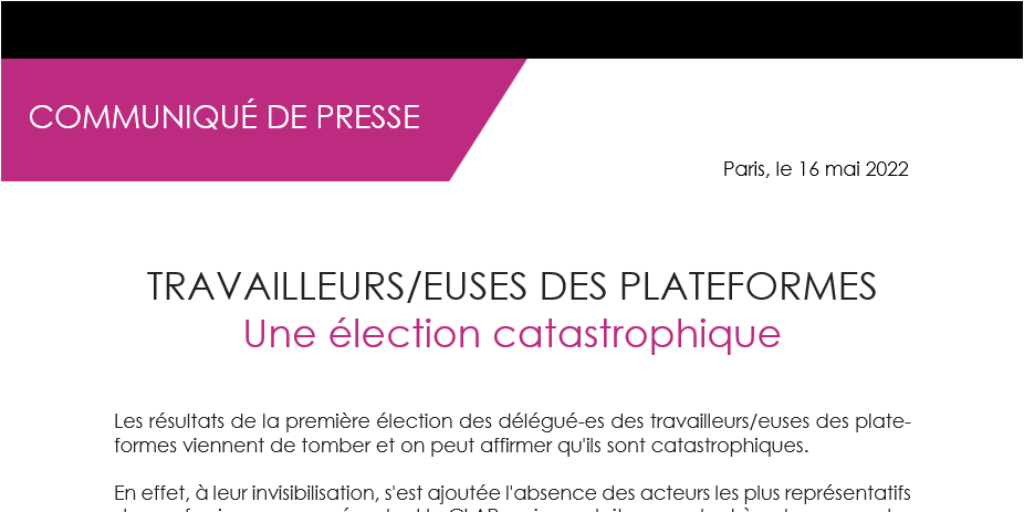 Les résultats de la première élection des délégué-es des travailleurs/euses des plateformes viennent de tomber et on peut affirmer qu'ils sont catastrophiques.