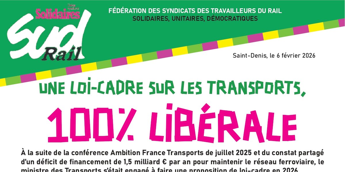 À la suite de la conférence Ambition France Transports de juillet 2025 et du constat partagé d’un déficit de financement de 1,5 milliard € par an pour maintenir le réseau ferroviaire, le ministre des Transports s’était engagé à faire une proposition de loi-cadre en 2026. SUD-Rail a eu accès a ce projet de loi prévu d’être examiné au parlement au printemps, ainsi qu’à son étude d’impact. Le moins que l’on puisse dire c’est que derrière les bonnes intentions d’une loi-cadre sur les Transports se cache un projet qui vise à faire payer tout le monde, sauf l’État et le patronat. Quant aux autres grandes décisions, elles sont renvoyées à une hypothétique loi de programmation qui verrait le jour… après les élections de 2027 !