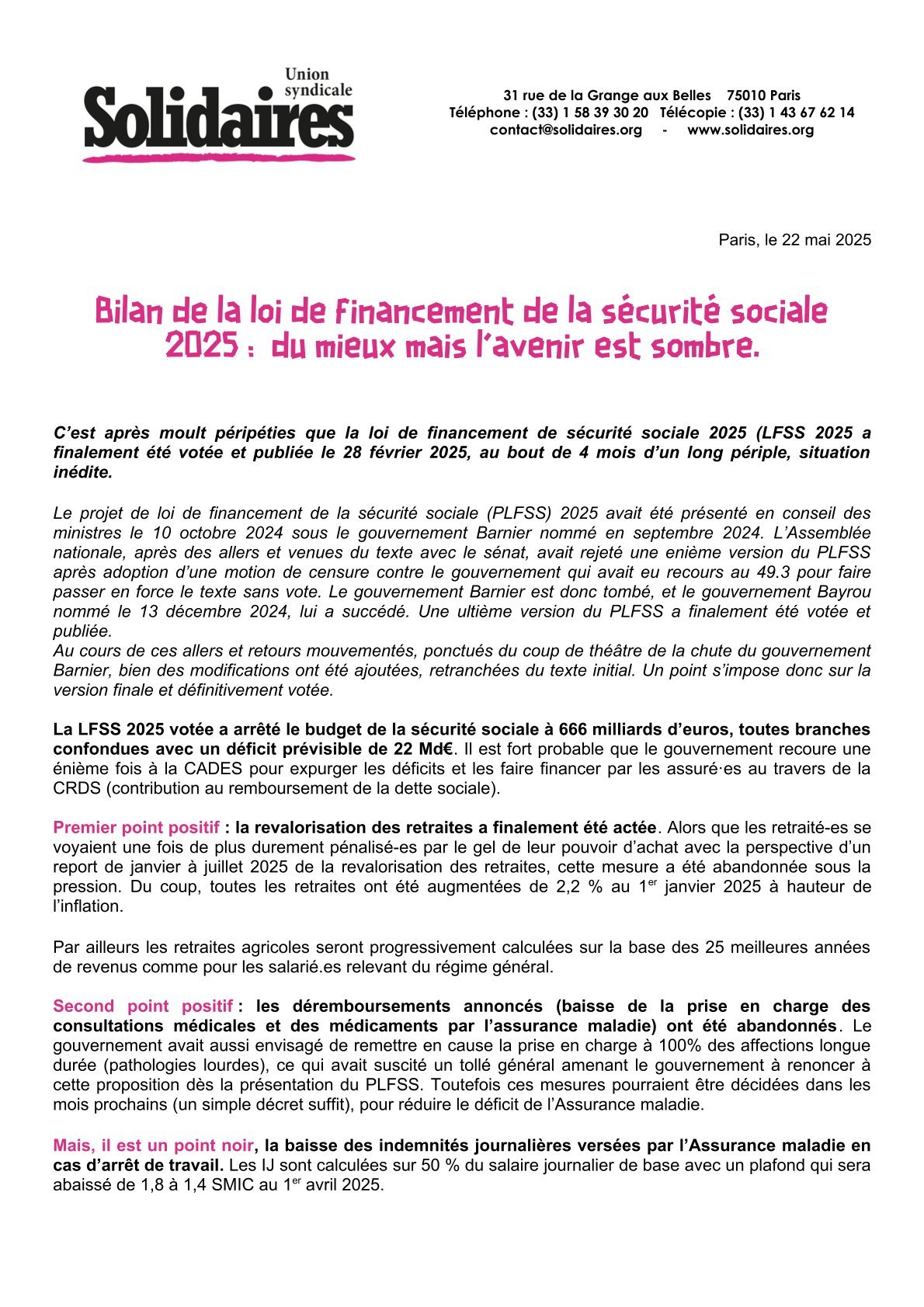 Premier point positif : la revalorisation des retraites a finalement été actée. Alors que les retraité-es se voyaient une fois de plus durement pénalisé-es par le gel de leur pouvoir d’achat avec la perspective d’un report de janvier à juillet 2025 de la revalorisation des retraites, cette mesure a été abandonnée sous la pression. Du coup, toutes les retraites ont été augmentées de 2,2 % au 1er janvier 2025 à hauteur de l’inflation.