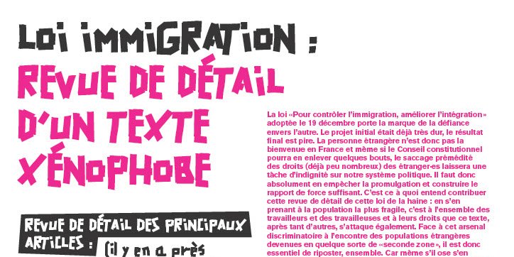 La loi « Pour contrôler l’immigration, améliorer l’intégration » adoptée le 19 décembre porte la marque de la défiance envers l’autre. Le projet initial était déjà très dur, le résultat final est pire. La personne étrangère n’est donc pas la bienvenue en France et même si le Conseil Constitutionnel pourra en enlever quelques bouts, le saccage prémédité des droits (déjà peu nombreux) des étranger-es laissera une tâche d’indignité sur notre système politique. Il faut donc absolument en empêcher la promulgation et construire le rapport de force suffisant. C’est ce à quoi entend contribuer cette revue de détail de cette loi de la haine : en s’en prenant à la population la plus fragile, c’est à l’ensemble des travailleurs et des travailleuses et à leurs droits que ce texte, après tant d’autres, s’attaque également. Face à cet arsenal discriminatoire à l’encontre des populations étrangères devenues en quelque sorte de « seconde zone », il est donc essentiel de riposter, ensemble. Car même s’il ose s’en défendre, ce sont bien les marqueurs racistes et xénophobes de l'extrême droite que Macron a fait imprimer à sa loi validée par sa majorité avec les voix du RN. C’est l’idée d’une France fermée, rance et apeurée, loin d’un pays d’ouverture et d’accueil qu’il vient d’imposer. Macron a ainsi fait sauter les dernières digues avec Le Pen, le mouvement social doit faire sauter cette loi et son monde.