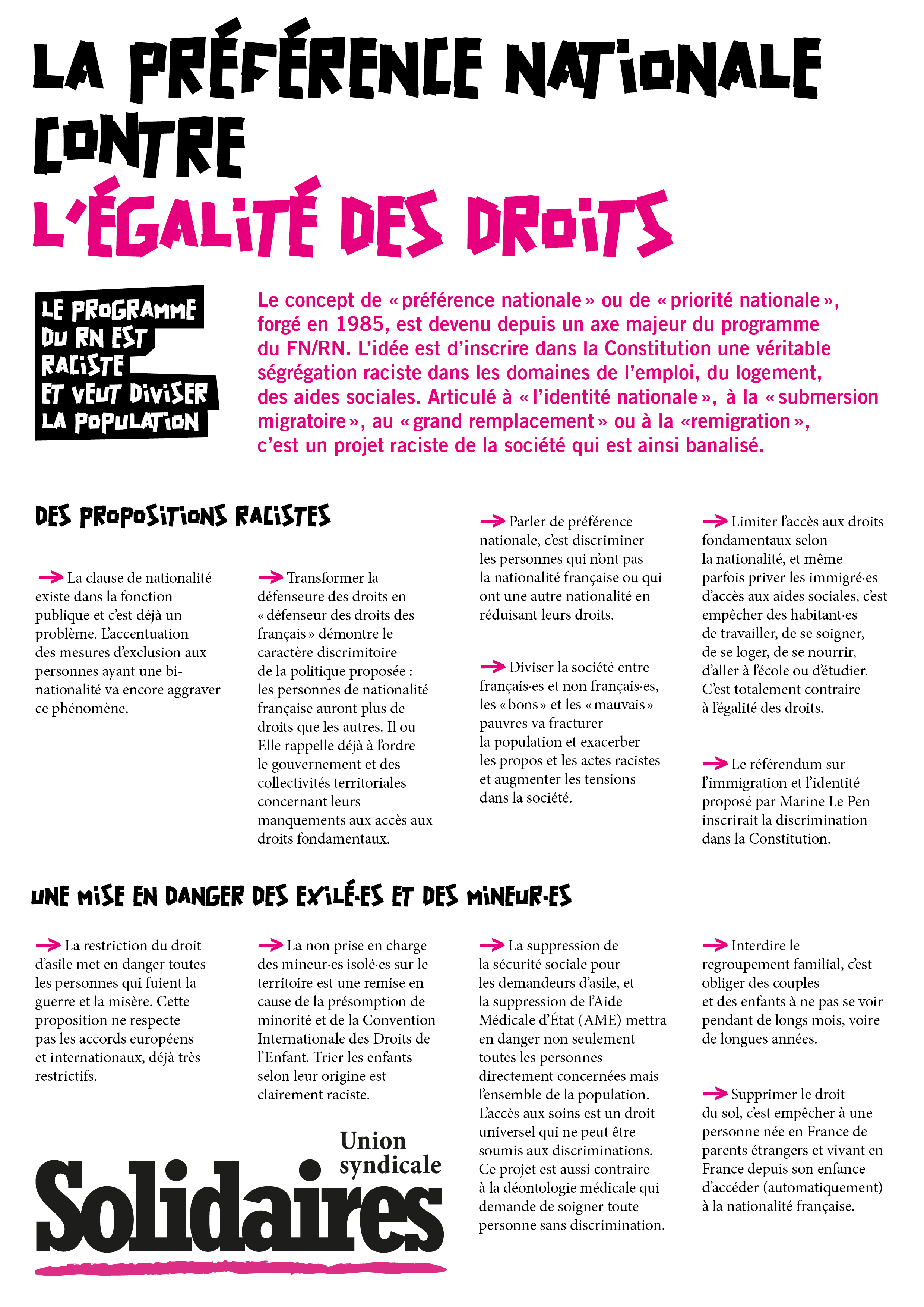 Le concept de “ préférence nationale ” ou de “ priorité nationale ”, forgé en 1985, est devenu depuis un axe majeur du programme du FN / RN. L’idée est d’inscrire dans la Constitution une véritable ségrégation raciste dans les domaines de l’emploi, du logement, des aides sociales. Articulé à “ l’identité nationale ”, à la “ submersion migratoire ”, au “ grand remplacement ” ou à la “ remigration ”, c’est un projet raciste de la société qui est ainsi banalisé.