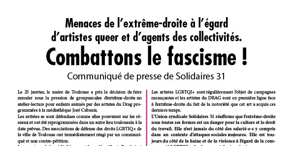 L’union syndicale Solidaires 31 réaffirme que l’extrême-droite sous toutes ses formes est un danger pour la culture et le droit du travail. Elle n’est jamais du côté des salarié-e-s y compris dans un contexte d’attaques sociales majeures. Elle est toujours du côté de la haine et de la violence à l’égard de la communauté LGBTQI+, des femmes et des immigré-e-s.