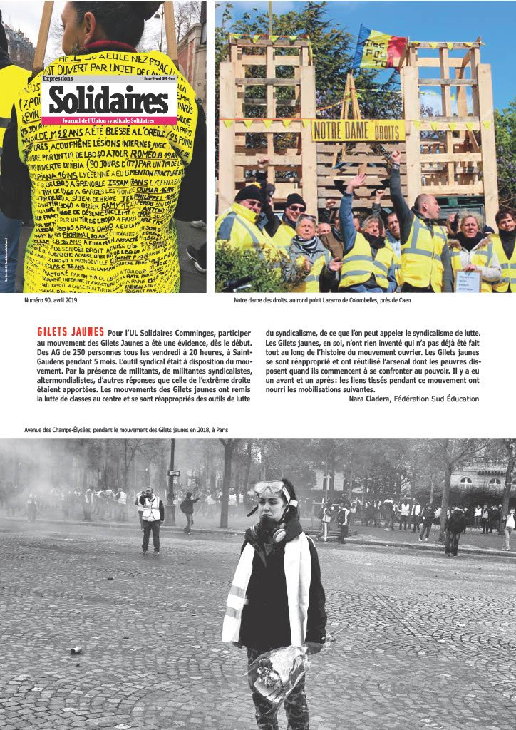 Pour l’UL Solidaires Comminges, participer au mouvement des Gilets Jaunes a été une évidence, dès le début. Des AG de 250 personnes tous les vendredi à 20 heures, à Saint-Gaudens pendant 5 mois. L’outil syndical était à disposition du mouvement. Par la présence de militants, de militantes syndicalistes, altermondialistes, d’autres réponses que celle de l’extrême droite étaient apportées.