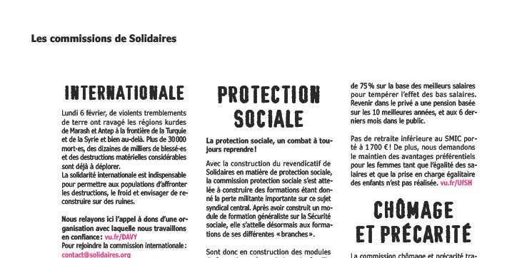 Cependant un tel chantier a besoin de bras ! Il est donc important que les structures de solidaires s’impliquent dans notre commission : contact@solidaires.org à l’attention de Evelyne et Elie.