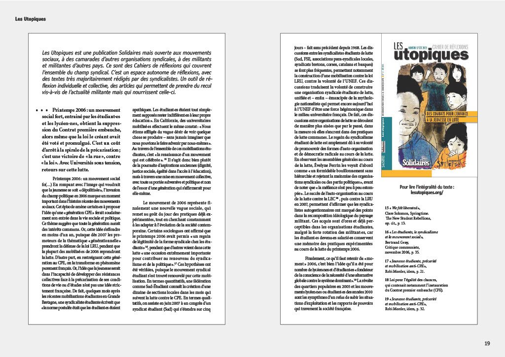 [20] Brochure « Emploi des jeunes », Sud-Étudiant/Solidaires, mai 2011. [15] « We felt liberated », Clare Solomon, Springtime. The New Student Rebellions, op. cit., p. 13.