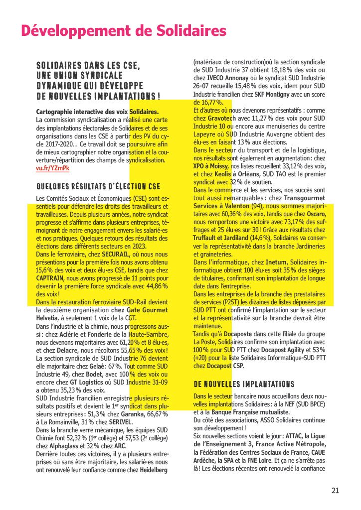 Et d’autres où nous devenons représentatifs : comme chez Gravotech avec 11,27% des voix pour SUD Industrie 10 ou encore aux menuiseries du centre Lapeyre où SUD Industrie Auvergne obtient des élu·es en faisant 13% aux élections.