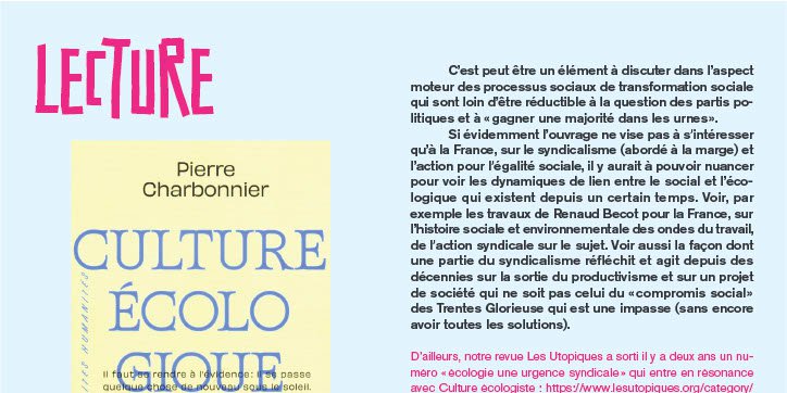 D'ailleurs, notre revue Les Utopiques a sorti il y a deux ans un numéro “écologie une urgence syndicale” qui entre en résonance avec Culture écologiste. https://www.lesutopiques.org/category/numero-15/ dont l'article “écologie moteur de la transformation sociale”