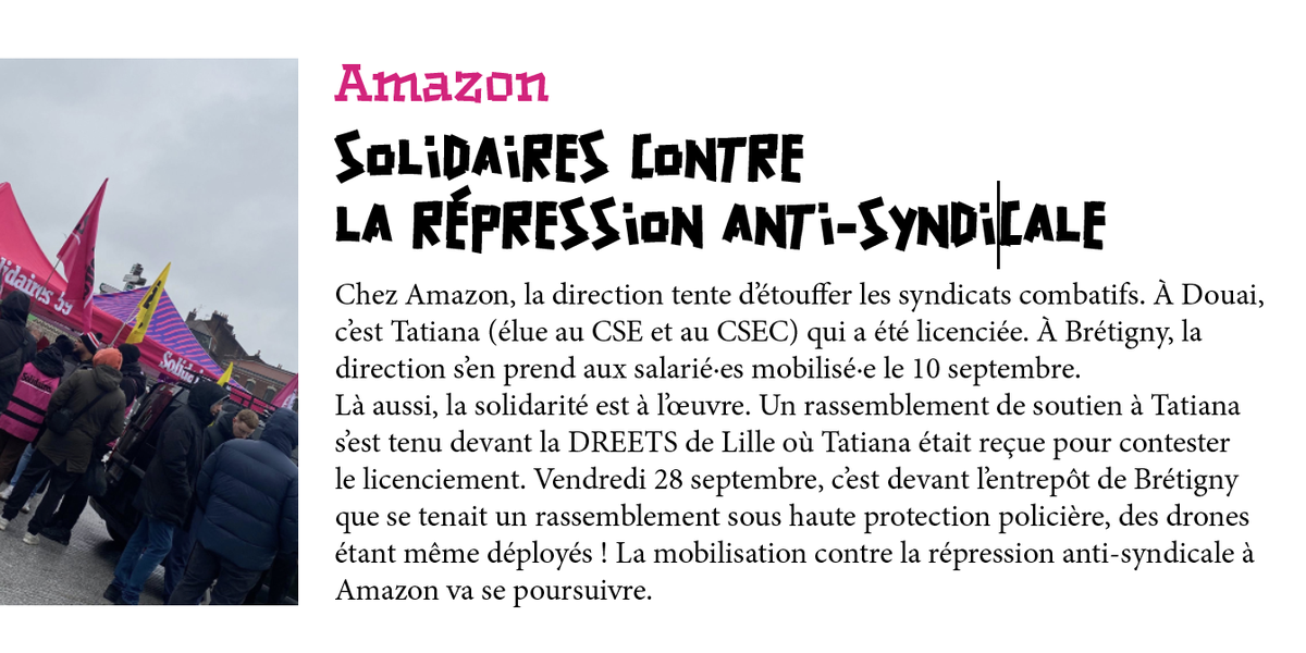 Chez Amazon, la direction tente d’étouffer les syndicats combatifs. À Douai, c’est Tatiana (élue au CSE et au CSEC) qui a été licenciée. À Brétigny, la direction s’en prend aux salarié·es mobilisé·e le 10 septembre.