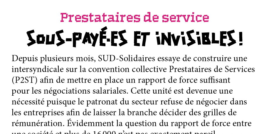 Depuis plusieurs mois, SUD-Solidaires essaye de construire une intersyndicale sur la convention collective Prestataires de Services (P2ST) afin de mettre en place un rapport de force suffisant pour les négociations salariales. Cette unité est devenue une nécessité puisque le patronat du secteur refuse de négocier dans les entreprises afin de laisser la branche décider des grilles de rémunération. Évidemment la question du rapport de force entre une société et plus de 16 000 n’est pas exactement pareil…