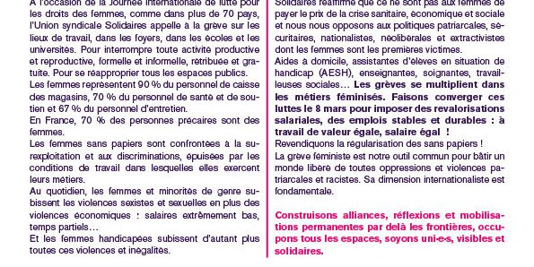 Solidaires réaffirme que ce ne sont pas aux femmes de payer le prix de la crise sanitaire, économique et sociale et nous nous opposons aux politiques patriarcales, sécuritaires, nationalistes, néolibérales et extractivistes dont les femmes sont les premières victimes. Aides à domicile, assistantes d'élèves en situation de handicap (AESH), enseignantes, soignantes, travailleuses sociales… Les grèves se multiplient dans les métiers féminisés. Faisons converger ces luttes le 8 mars pour imposer des revalorisations salariales, des emplois stables et durables : à travail de valeur égale, salaire égal ! Revendiquons la régularisation des sans papiers !