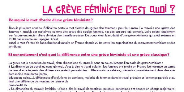 - La dimension du «travail» invisible : c’est-à-dire le travail domestique, puisque les femmes ont encore en charge majoritairement les tâches ménagères et le soin, l’éducation des enfants. Il ne s’agit donc pas de cloisonner cet appel à la grève au seul travail salarié. La situation des femmes, des inégalités qu’elles subissent, est liée à un rapport de domination qui couvre toutes les situations de vie : sa place dans la société, sa place en tant qu’être sexué, sa place au travail.