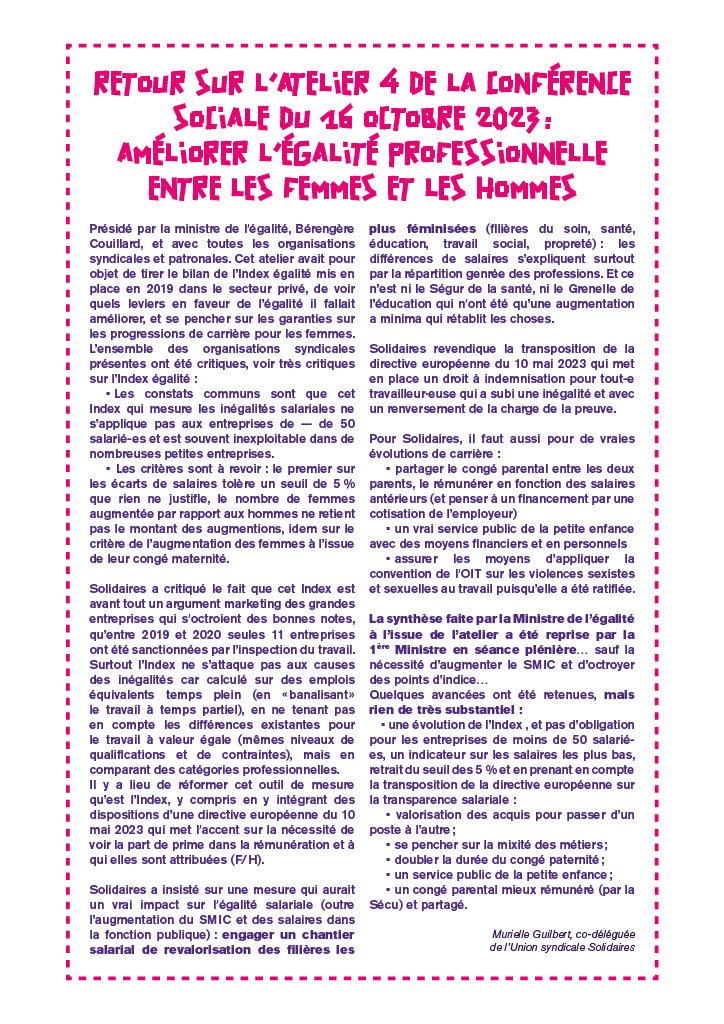 La synthèse faite par la Ministre de l’égalité à l’issue de l’atelier a été reprise par la 1ère Ministre en séance plénière...sauf la nécessité d’augmenter le SMIC et d’octroyer des points d’indice …