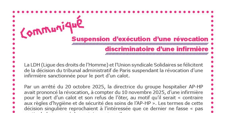 La LDH (Ligue des droits de l’Homme) et l’Union syndicale Solidaires se félicitent de la décision du tribunal administratif de Paris suspendant la révocation d’une infirmière sanctionnée pour le port d’un calot.