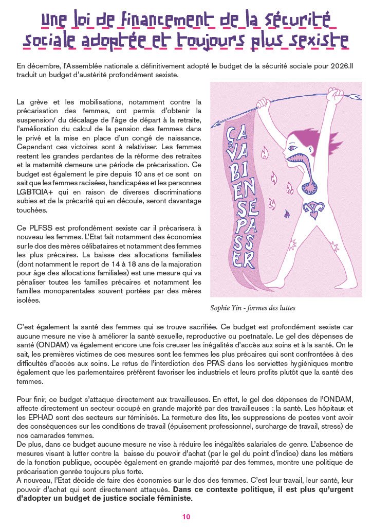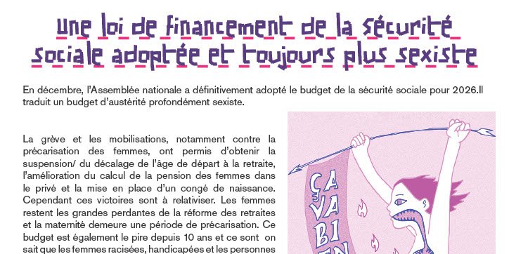 Il traduit un budget d’austérité profondément sexiste. La grève et les mobilisations, notamment contre la précarisation des femmes, ont permis d’obtenir la suspension/ du décalage de l’âge de départ à la retraite, l’amélioration du calcul de la pension des femmes dans le privé et la mise en place d’un congé de naissance. Cependant ces victoires sont à relativiser. Les femmes restent les grandes perdantes de la réforme des retraites et la maternité demeure une période de précarisation. Ce budget est également le pire depuis 10 ans et ce sont on sait que les femmes racisées, handicapées et les personnes LGBTQIA+ qui en raison de diverses discriminations subies et de la précarité qui en découle, seront davantage touchées.