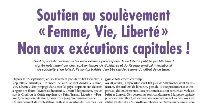 - Nous soutenons les travailleurs et travailleuses d’Iran dans leur lutte pour la dignité, leurs droits à se défendre par la grève ainsi que par la construction de syndicats et d’organisations politiques.