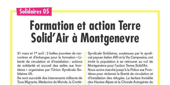 Syndicale Solidaires, soutenues par le syndicat paysan italien ARI et la Via Campesina, ont invité la population à se retrouver au col de Montgenèvre pour l’action Terres Solid’Air.