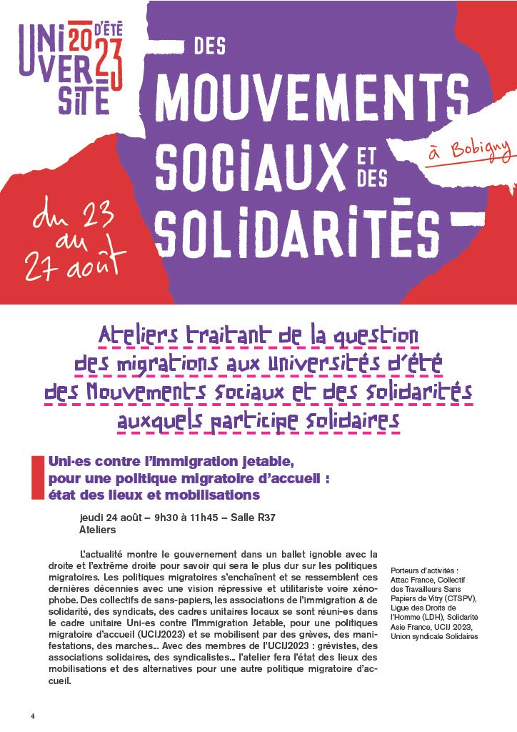Attac France, Collectif des Travailleurs Sans Papiers de Vitry (CTSPV), Ligue des Droits de l’Homme (LDH), Solidarité Asie France, UCIJ 2023, Union syndicale Solidaires