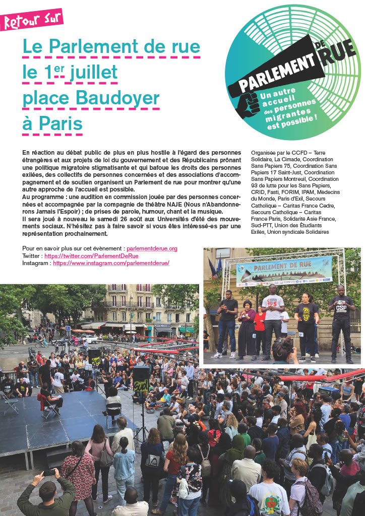 En réaction au débat public de plus en plus hostile à l’égard des personnes étrangères et aux projets de loi du gouvernement et des Républicains prônant une politique migratoire stigmatisante et qui bafoue les droits des personnes exilées, des collectifs de personnes concernées et des associations d’accompagnement et de soutien organisent un Parlement de rue pour montrer qu’une autre approche de l’accueil est possible.